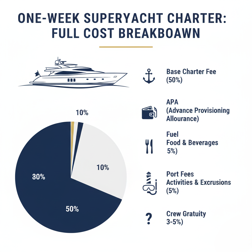 Let’s understand better with a realistic superyacht cost guide for a week-long Mediterranean charter on a 120-foot yacht.